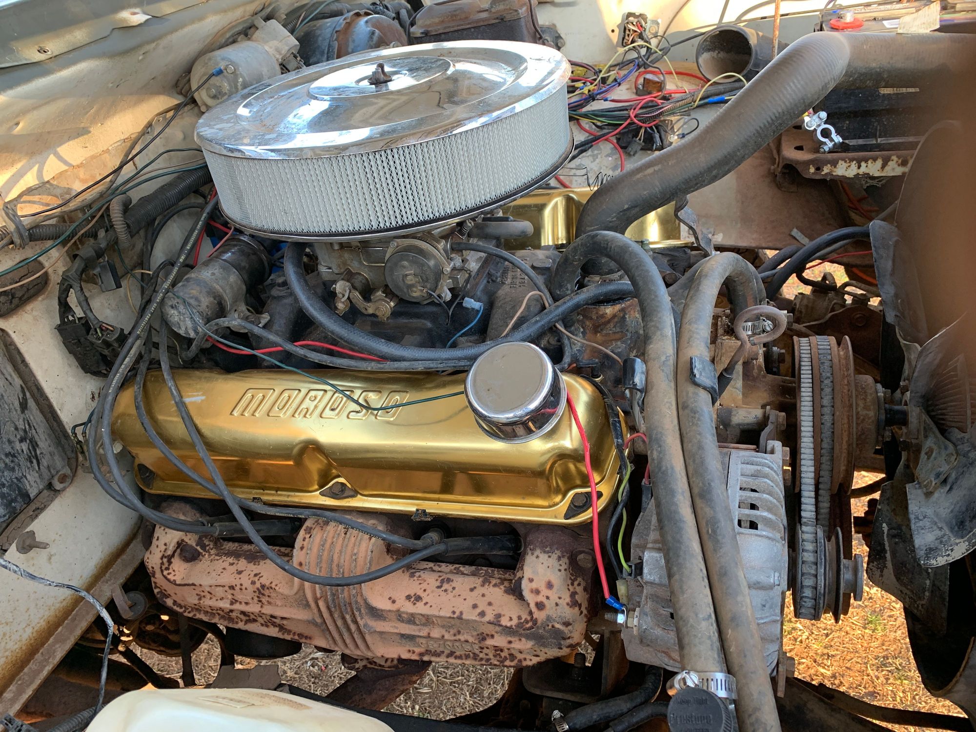 318 cid crate motor, which was actually surplus for an M880/890, it was still in a styrofoam filled crate. It has an edelbrock aluminum manifold with a edelbrock four barrel carburetor on top. Also has a nice set of moroso valve covers. When I can find a set of headers that I can afford it will have them also.