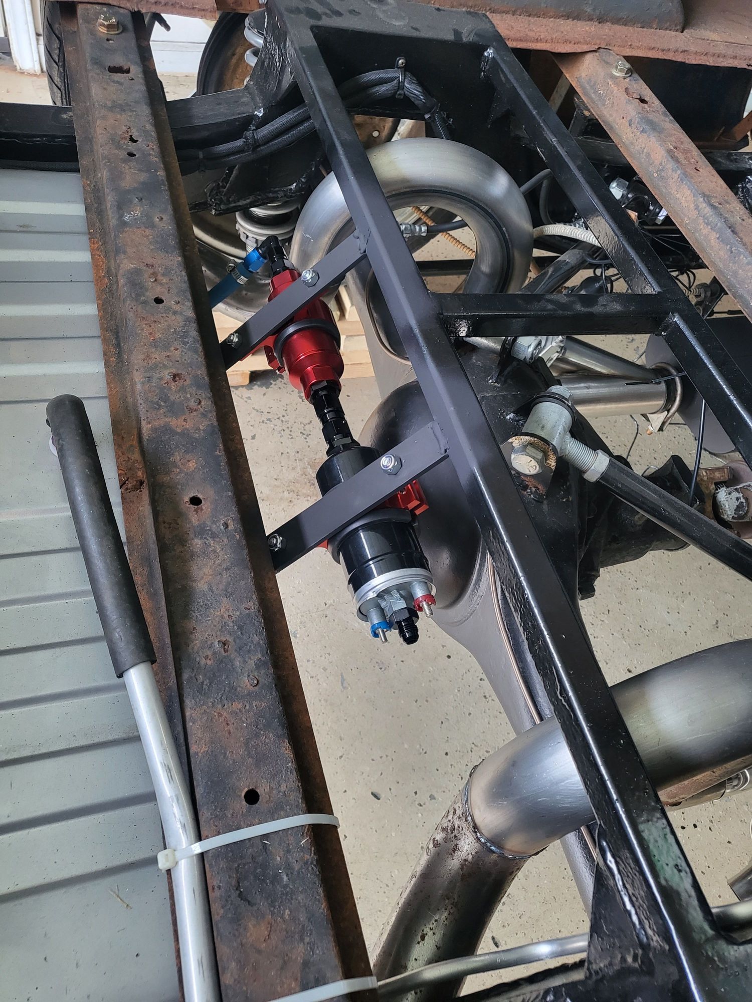 Pump and filter. The bracket is welded top and bottom to the frame.
