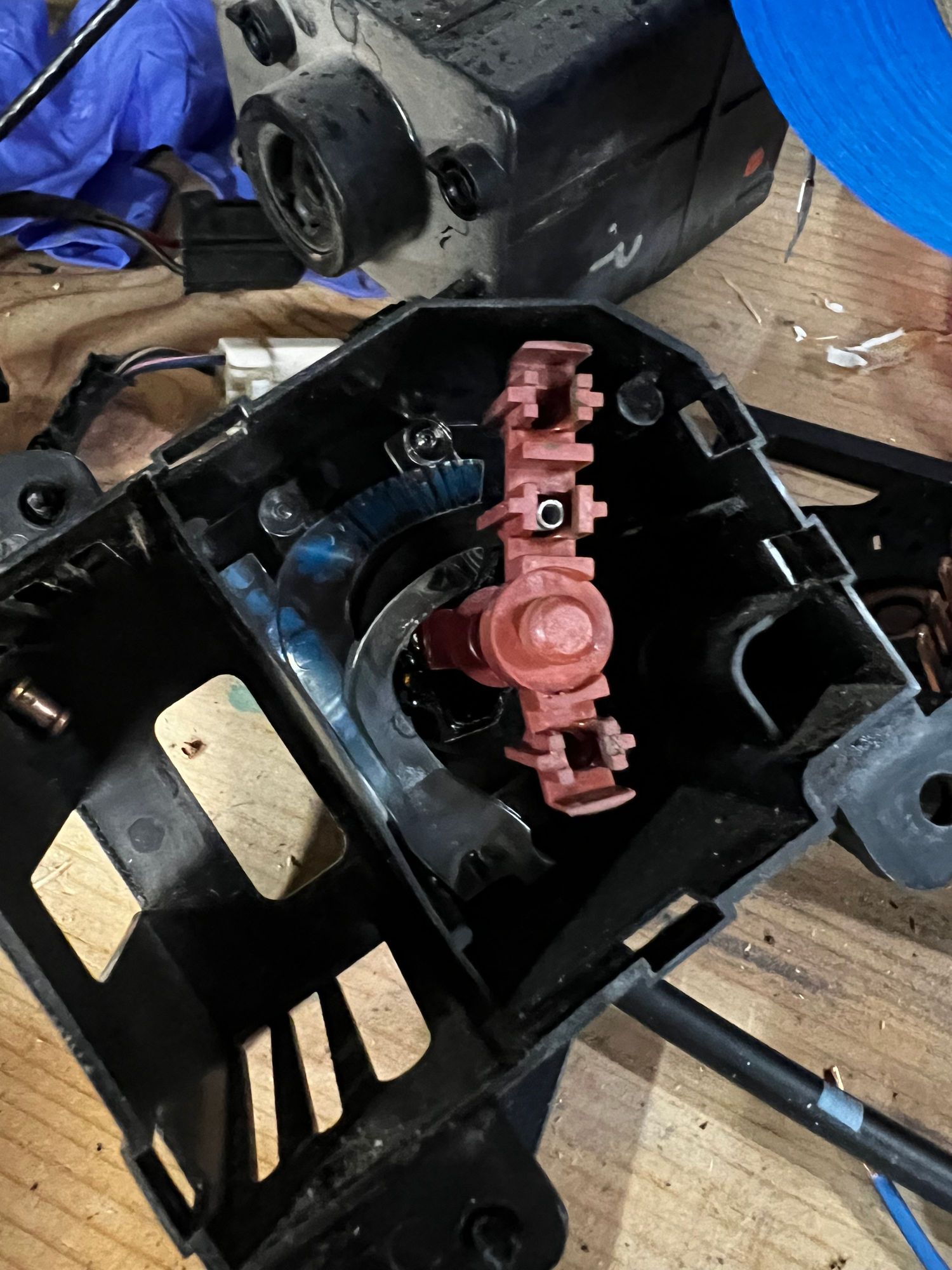 This is the backside of your actually headlight switch. This is very delicate to put together in fact the springs as you can see in the top middle go inside. There is a cylinder piece of copper that sits on those springs and has held in contact with a circuit board just through the entire component being put back together