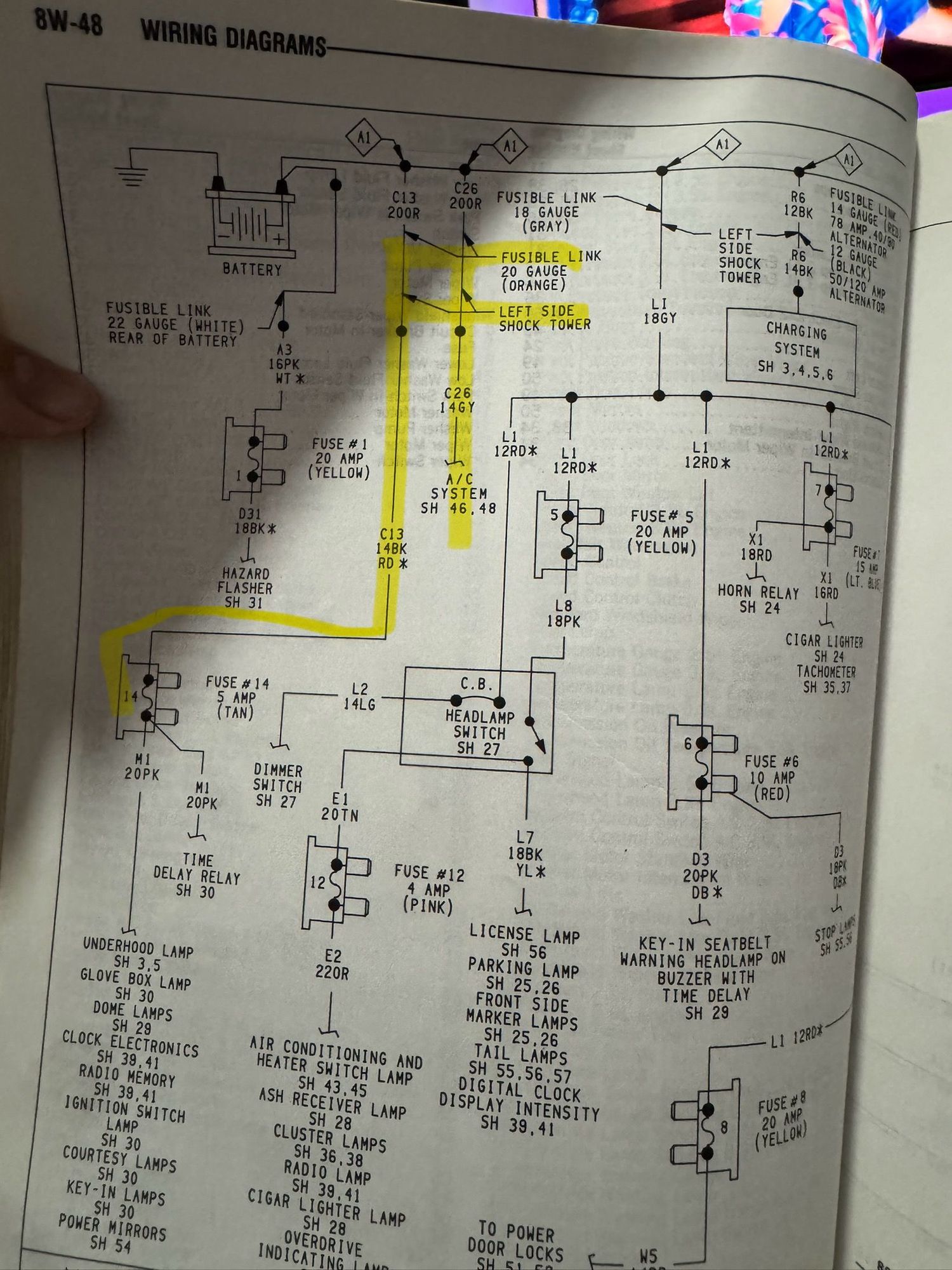 Highlighted fuse has no power to it. Traced that wire by fusible links and the black/red has power.