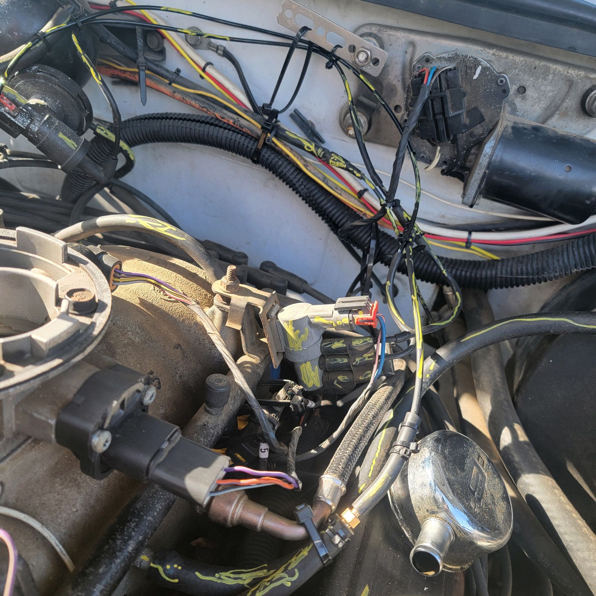 Showing in fore ground, 1/4in X 1/8in barbed adapter and vacuum hose to hard line. Yellow on purge solenoid, to hard vacuum lines moved to firewall. Maybe I can fab a shelf either under the convolted wire bundle or above it, to hold the EGR and the purge solenoid.