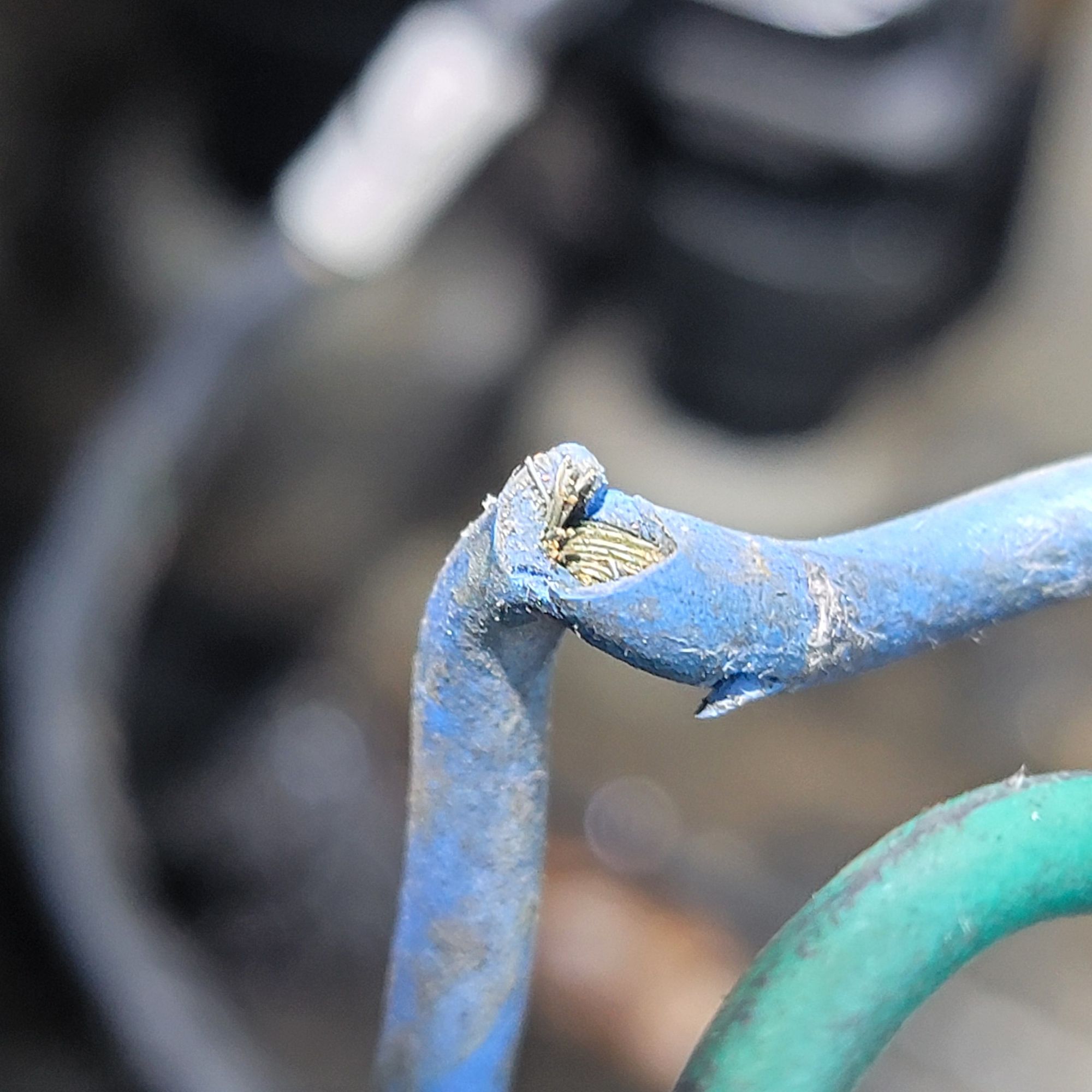 Where one of the previous owners, mechanic was checking for power ? Whom ever almost severed the wire. Then I noticed this----->