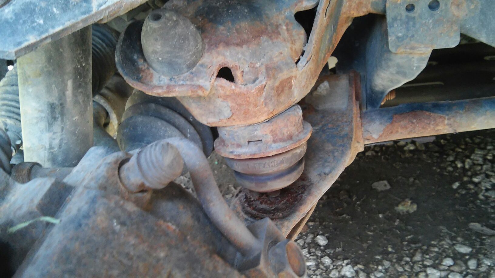 You can see that the bushing is attached to the flange(above) that comes off the frame. Below the bushing is the lower control arm. They bushing isn't in contact with the lower control arm now because the durango is jacked up.