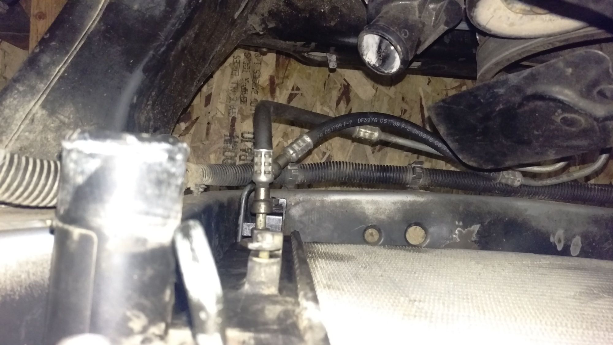 The top line is the 12 inch factory tube. The bottom goes back to the tranny. The other is from the tranny and wraps around the side of the radiator and connects to the added oil cooler.