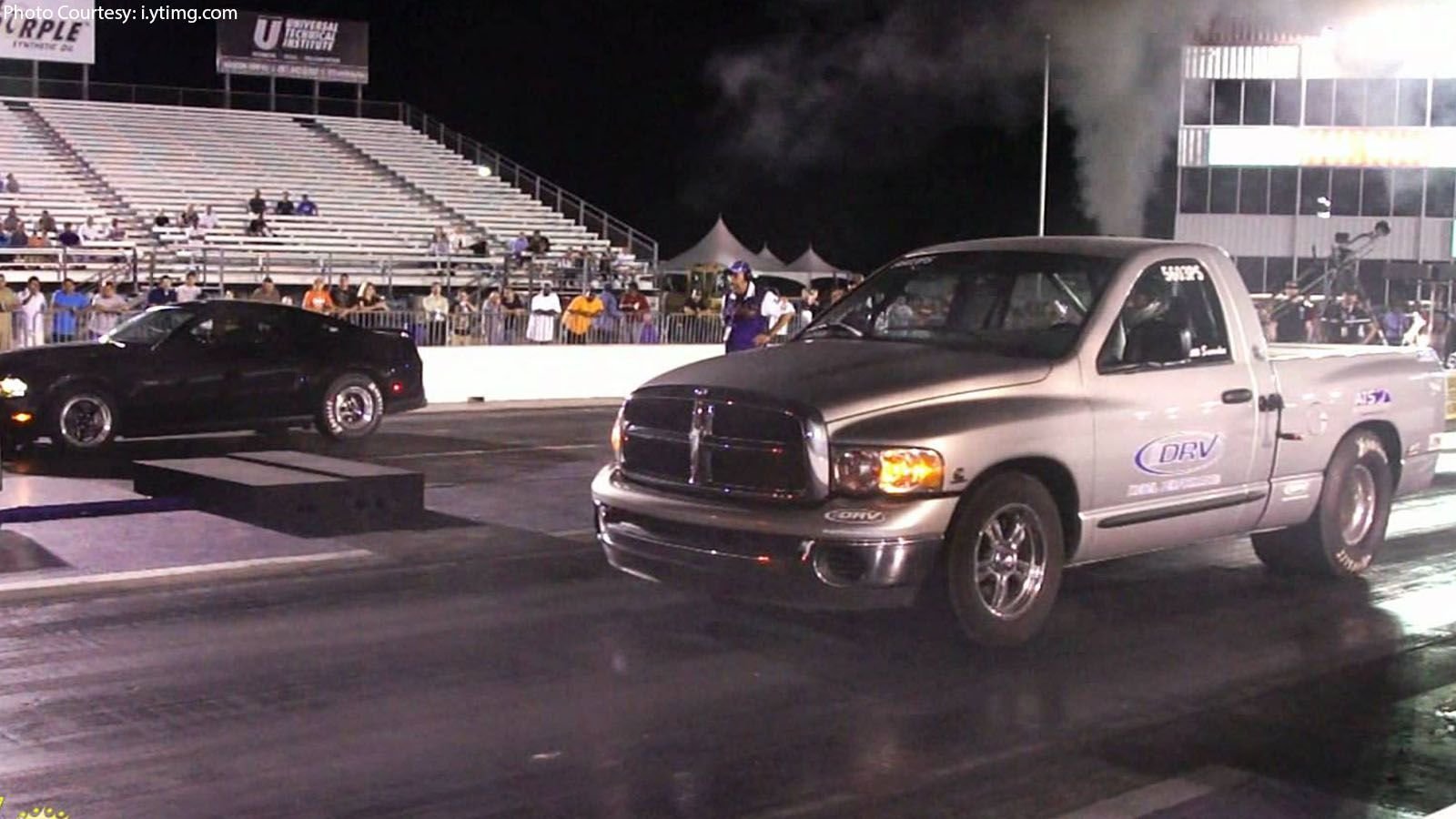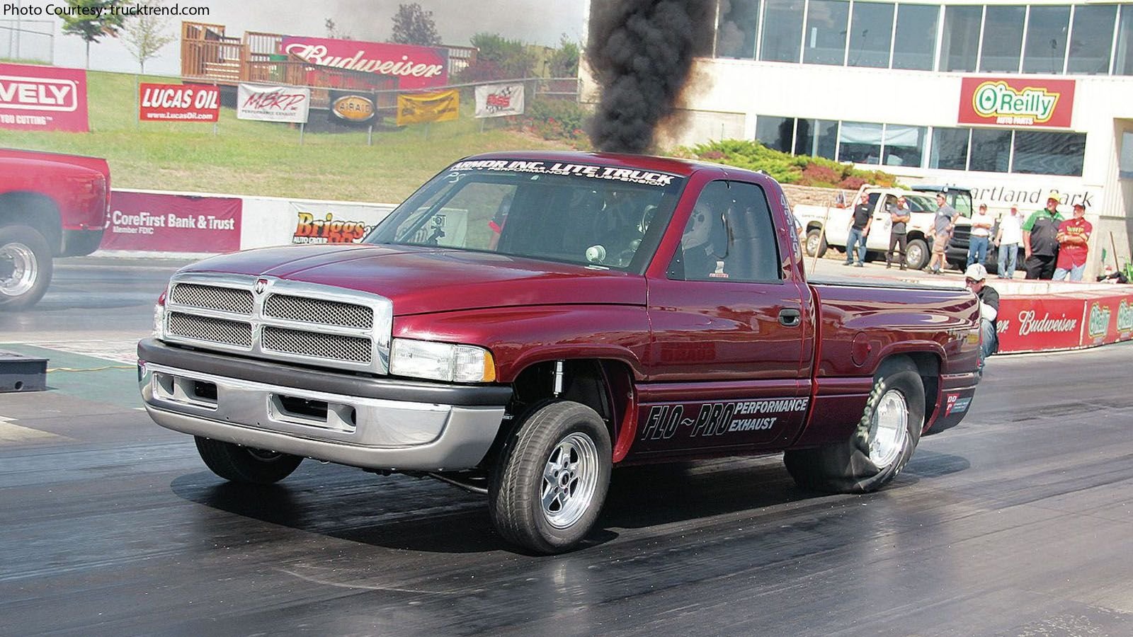 This Dodge Ram is getting a great start in this drag race. Take a good look at the rear tire to get a grasp of the amount of power that is being generated by this Ram 15000.