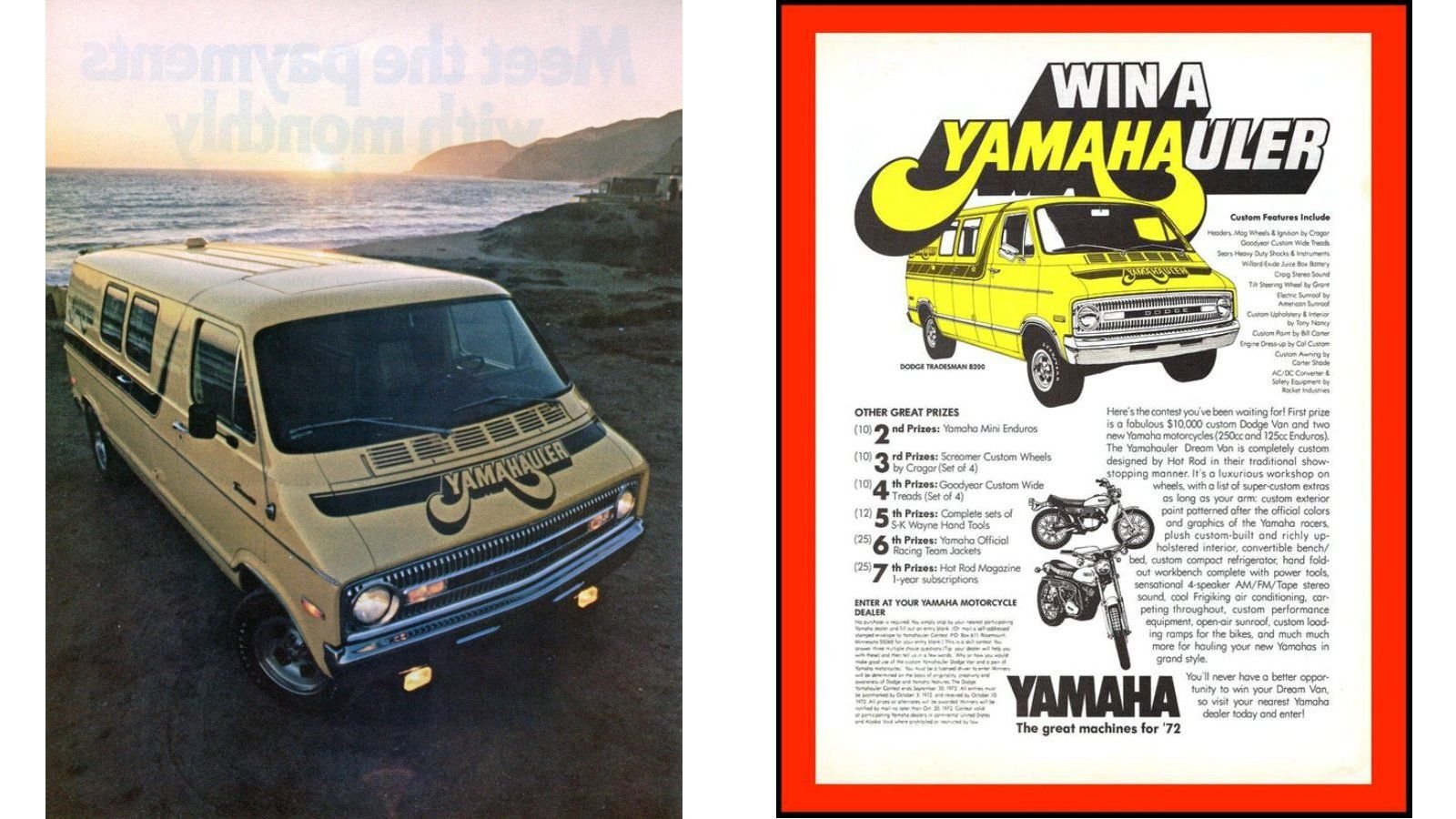 It really is hard to pin down how many Yamahauler vans were made. The original was a Hot Rod magazine project van that was customized and given away in 1972 as a promotion, as seen in the picture. But afterward there may have been a limited run from the factory, or else dealer-created replicas, with the slot mag wheels and distinctive muscle car style stripe decals. Full-sized vans and motorcycle racing go together like peanut butter and jelly, so it is no surprise the Yamahauler was a hit. Since the decals are available in reproduction today, you have to wonder what a 2016 Ram ProMaster Van customized like this would look like.