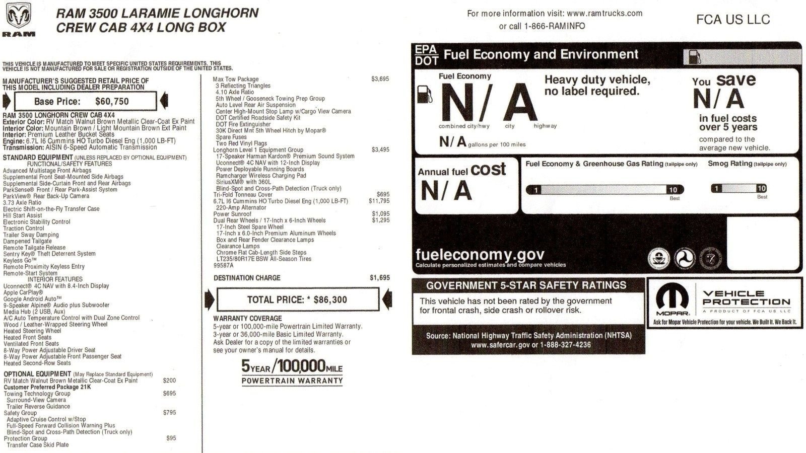 The RAM 3500 Laramie Longhorn Crew cab 4x4 Long Box was loaded up with everything. This explains the long name, as well as the long list of options on the window sticker. This brings the base price from $60,750 to $86,300. This might seem like a lot, but when compared to many mid-sized SUV's on the market with a similar price tag, and less workability, the RAM 3500 seems like a better value. It's a small price to pay to be driving the king of trucks!