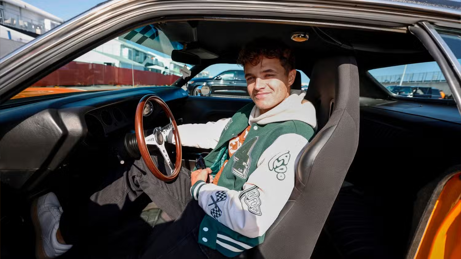 Lando Norris swaps his sleek McLaren for a retro American muscle car ahead of the US Grand Prix.