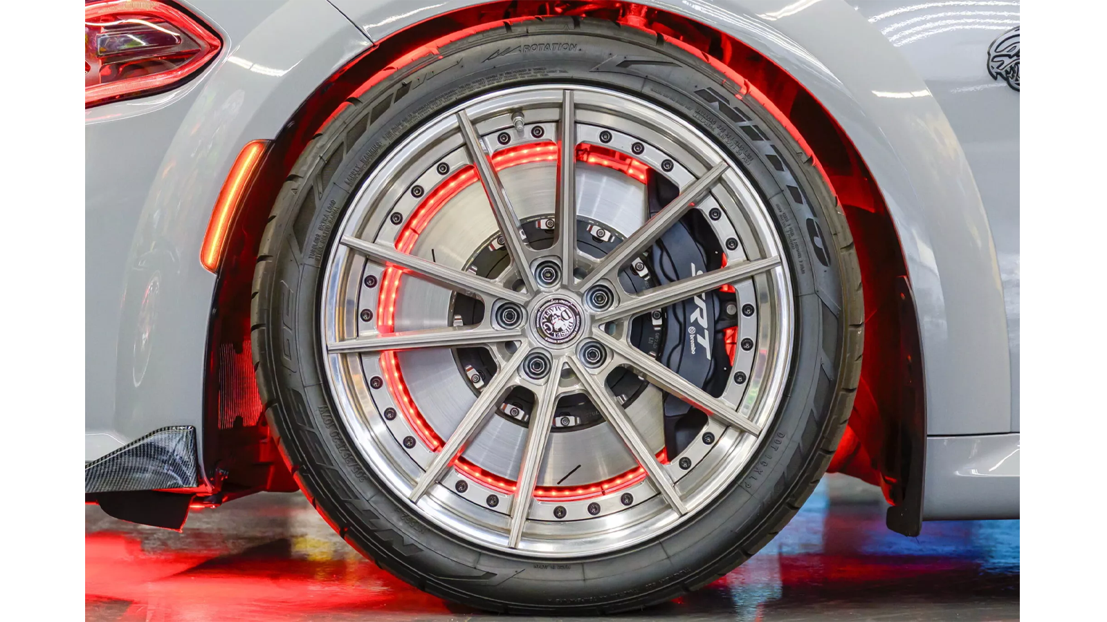 The "Shaqcat" wears a Smoke Show grey paint job that seems understated — until the custom red lighting hidden under the car and within the grille flips on, bathing the carbon fiber accents in a crimson glow. Special 20-inch Signature Performance wheels were created for this car alone, providing a subtle yet unmistakable visual signature.
