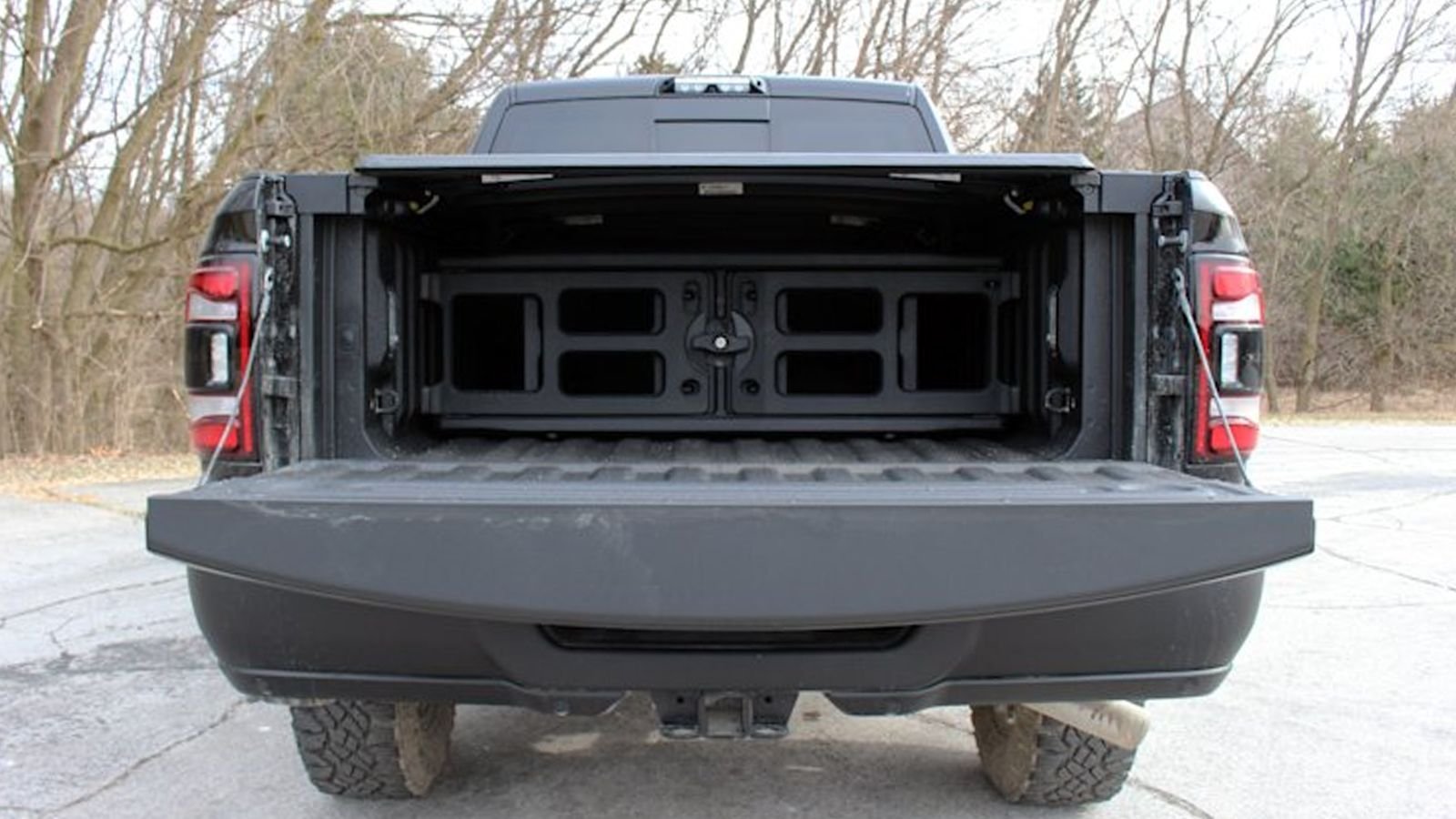 The Power Wagon's burly tailgate is seen open here, displaying its clever utility and well thought out functionality. A locking divider can be seen inside the bed, as well as heavy-duty sliders for cargo access and a clean top cover tightly sealing everything inside.