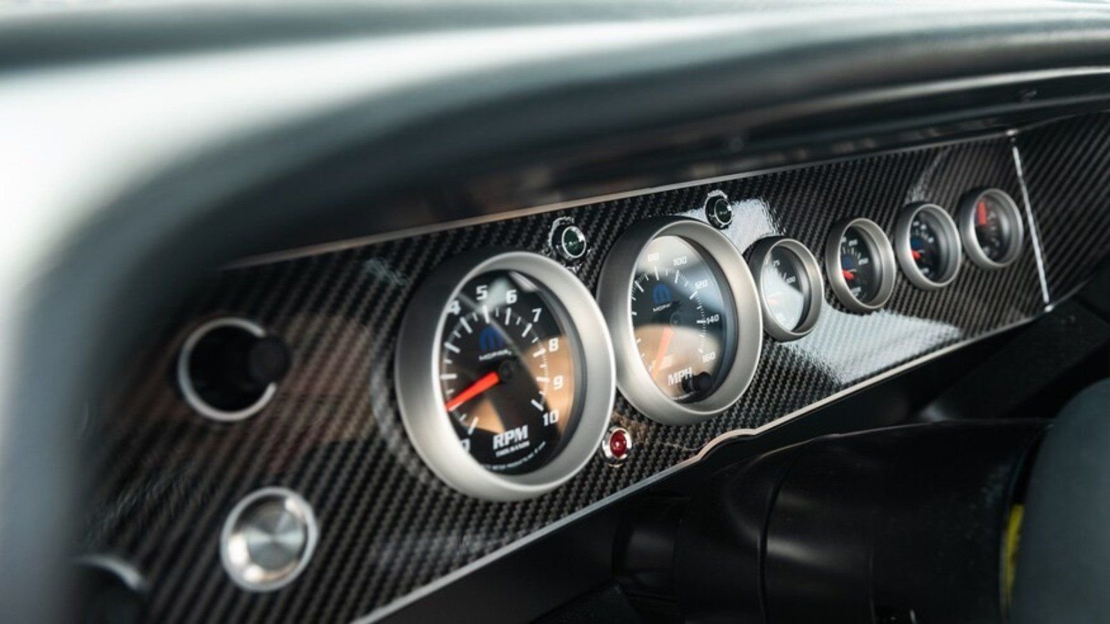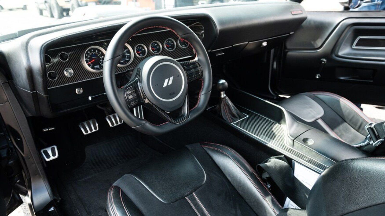 The interior of this Challenger also does a nice job of mixing the best of an old car and a new one. The original dash is loaded with modern black Mopar gauges, set in a gloss carbon fiber panel. Additional carbon has been added to the door panels, center console, and steering wheel.